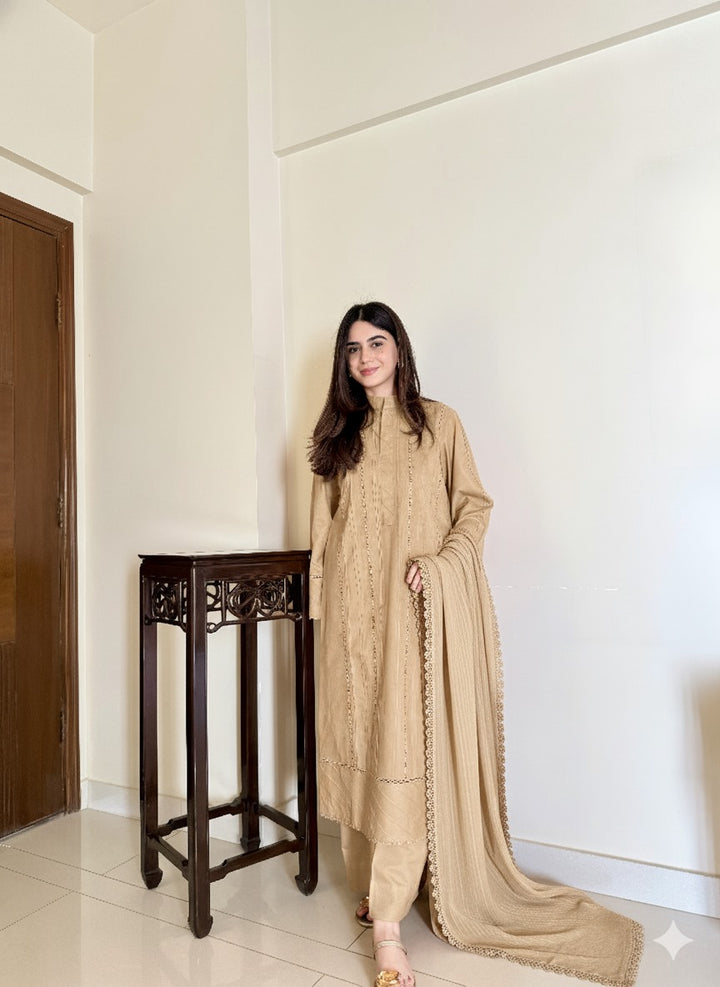 Discover luxury in the coldest of seasons with our Dhanak Solid Basics 3pc collection. Made with complete lacework on the front and a shawl, stay fashionably warm this winter. Elevate your style with our Solid Basics.