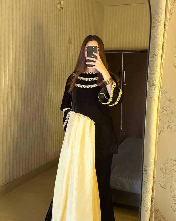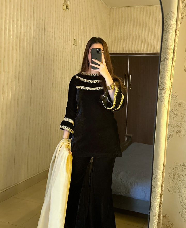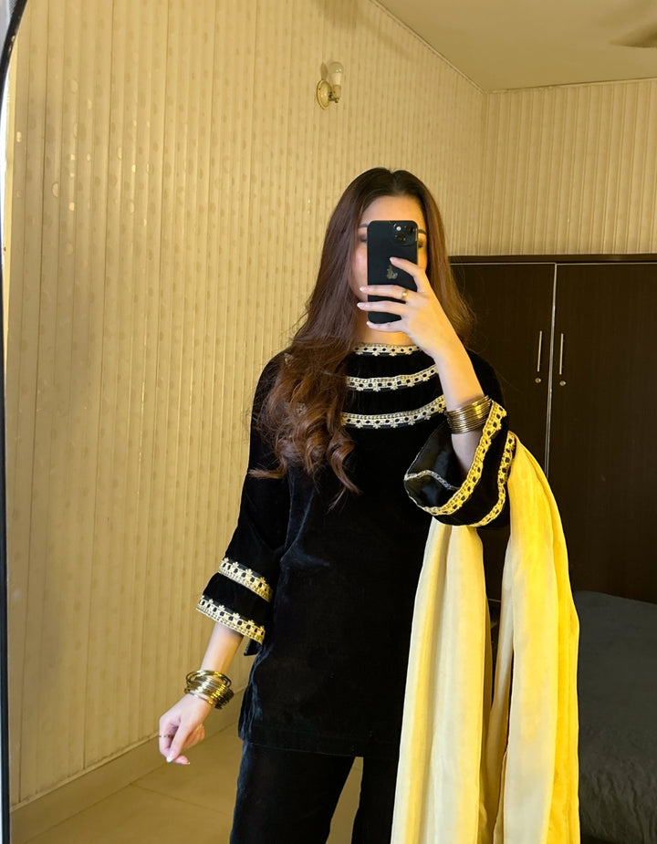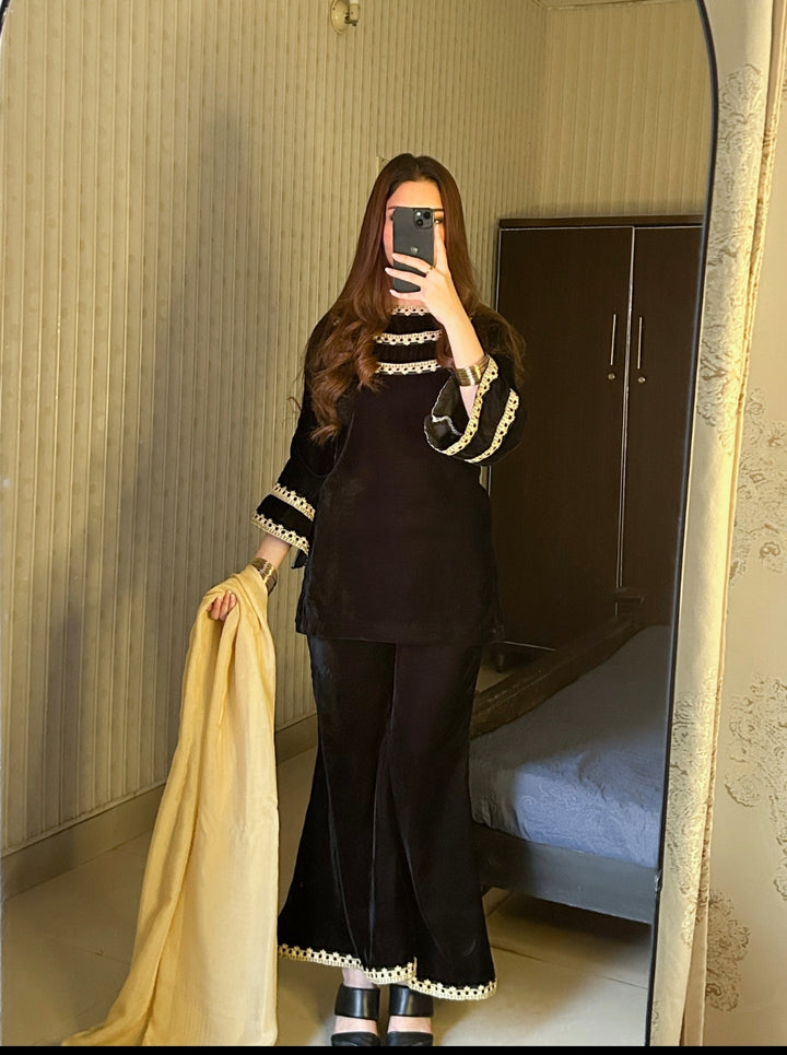 Introducing the Velvet Signature Edition '25—. Crafted from luxurious velvet, this sophisticated collection features intricate lacework embellishments adorning the shirt front, sleeves, and trouser. The design showcases a gracefully tailored short shirt paired with striking bell-style trousers, complete with ornate bottom detailing that commands attention. Available in all sizes, each piece delivers a statement of timeless luxury and contemporary style, perfect for those who appreciate the finer details.