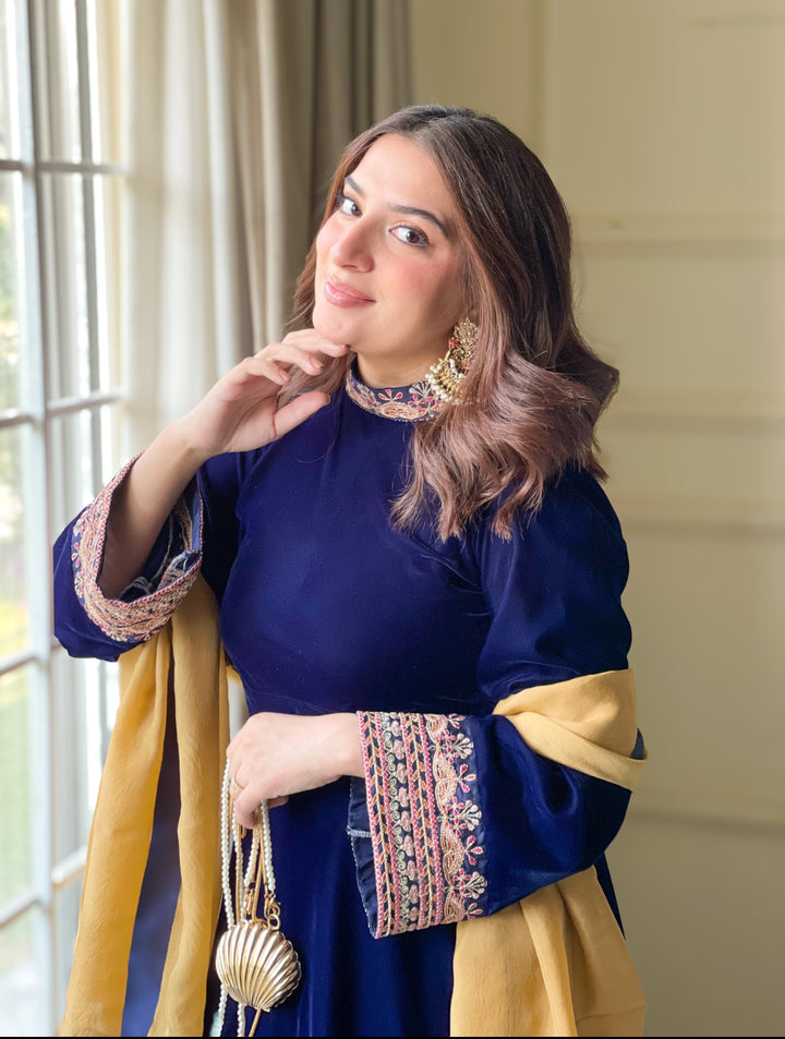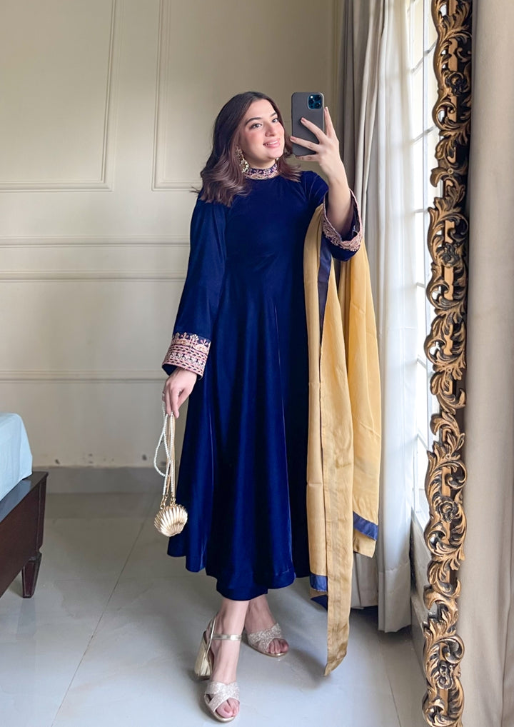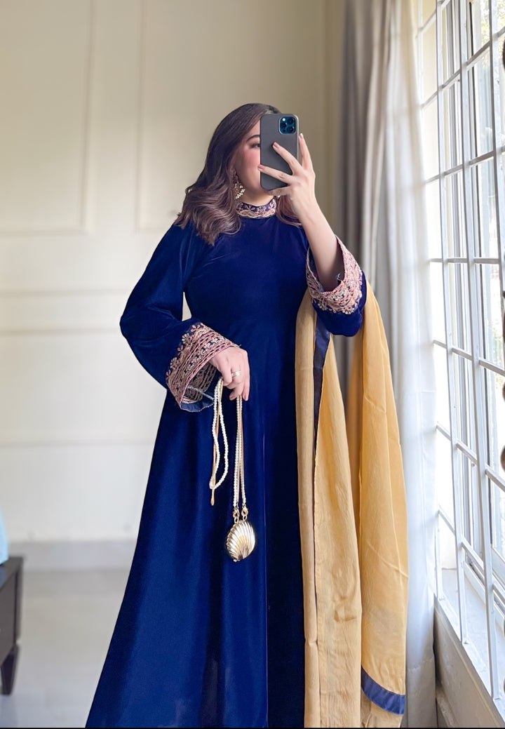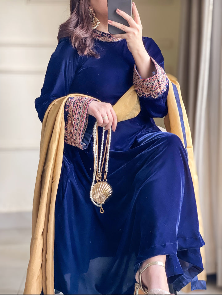 - This Long length Shirt, made in soft velvet fabric is adorned with beautiful Lacework embellishment on Neckline & Sleeves as well.